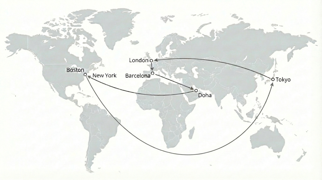 ロンドン → バルセロナ → ドーハ → ボストン → ニューヨーク。