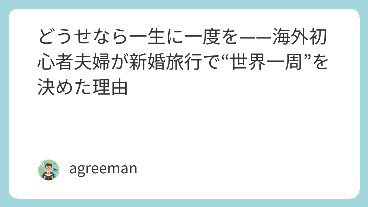 どうせなら一生に一度を——海外初心者夫婦が新婚旅行で“世界一周”を決めた理由